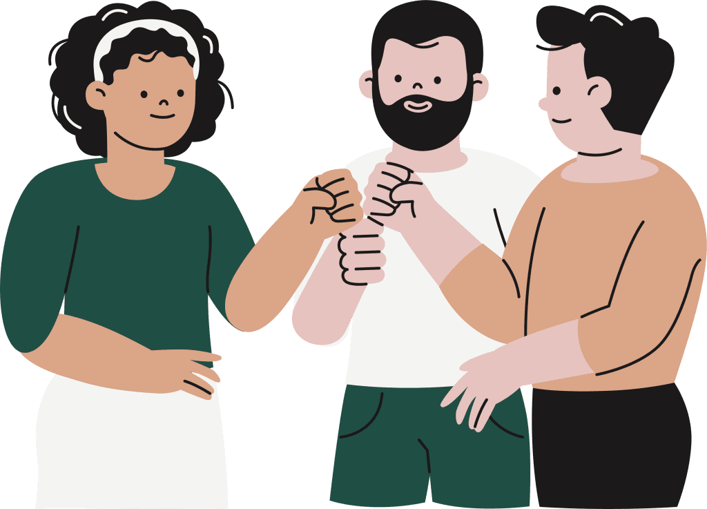Dos mujeres y un hombre sonriendo y el chico y una de las mujeres se hacen un saludo con el puño. La otra mira a la mujer. Visten de sport